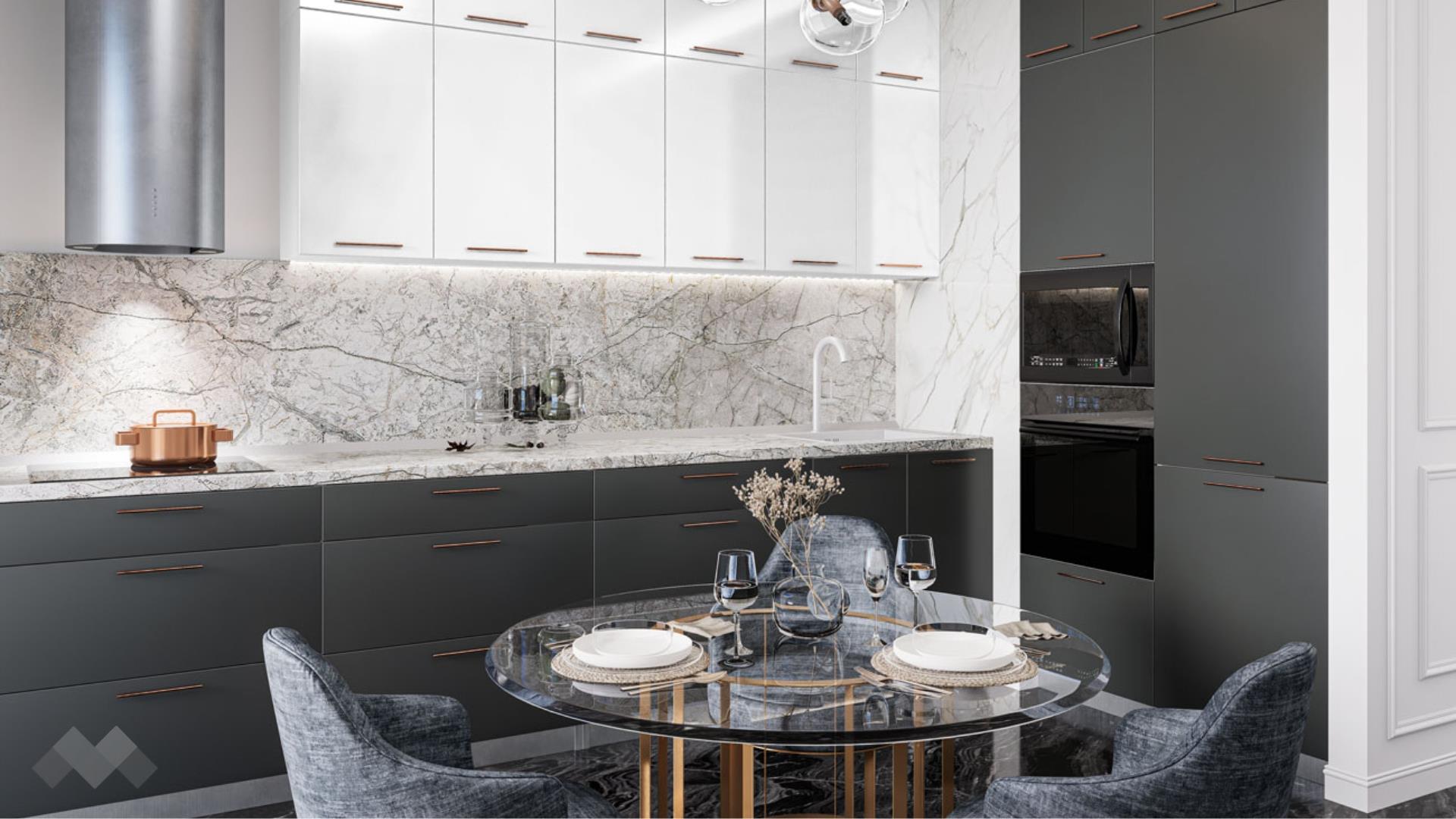Страхотната модерна комбинация между корпус бяло гладко и лице карбон мат с бял гланц, придава на кухнята характер и уют.
