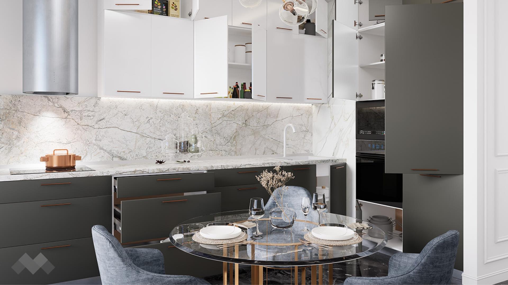 Страхотната модерна комбинация между корпус бяло гладко и лице карбон мат с бял гланц, придава на кухнята характер и уют.