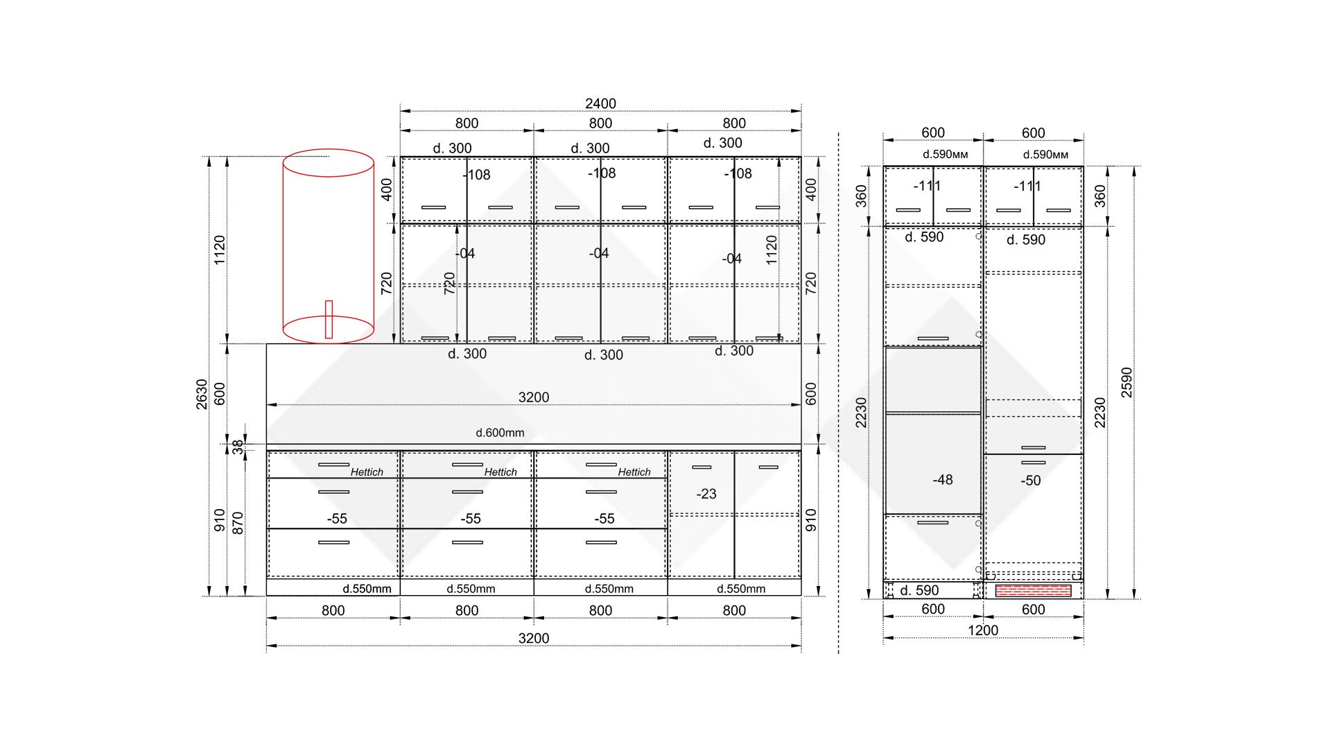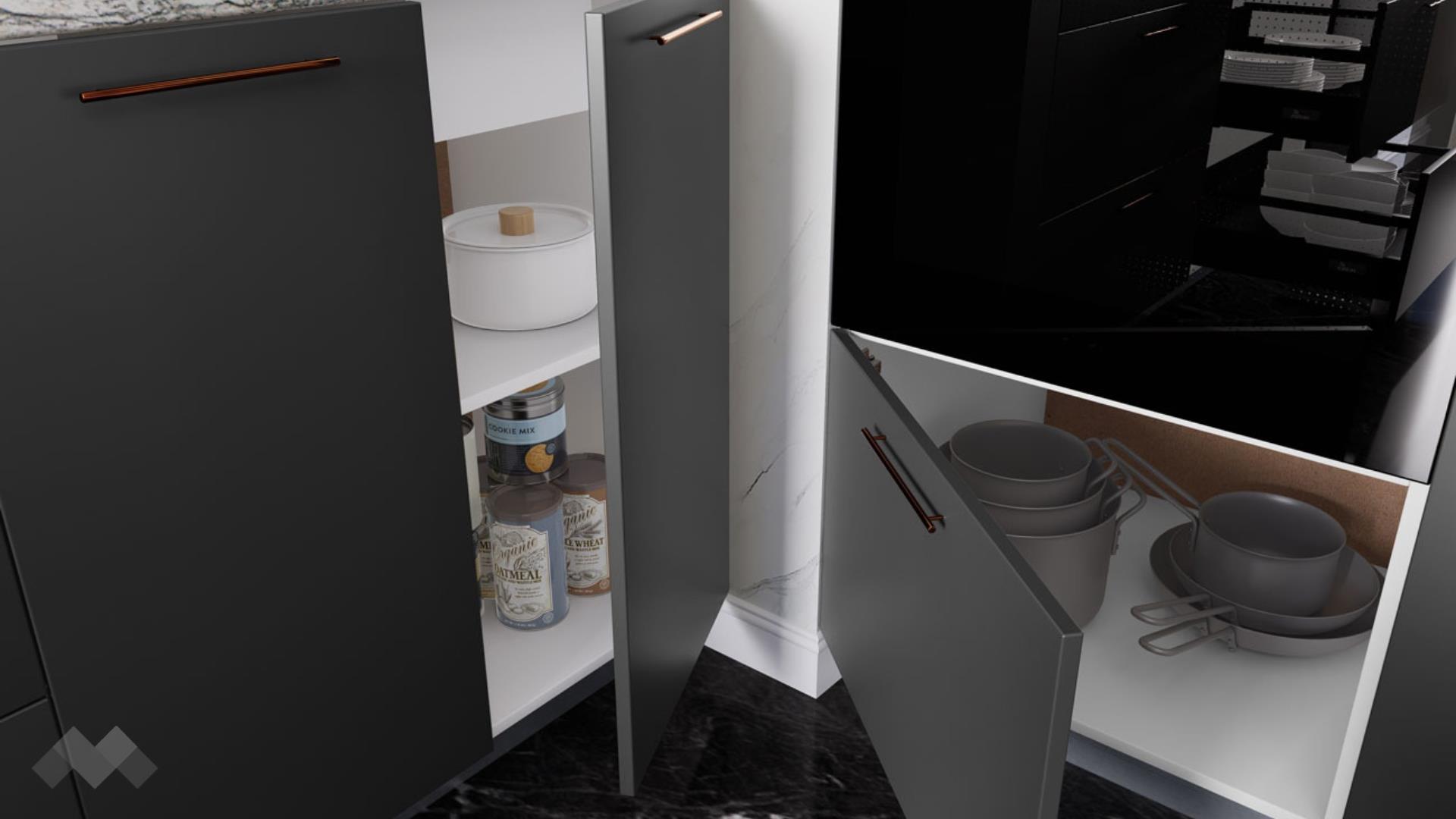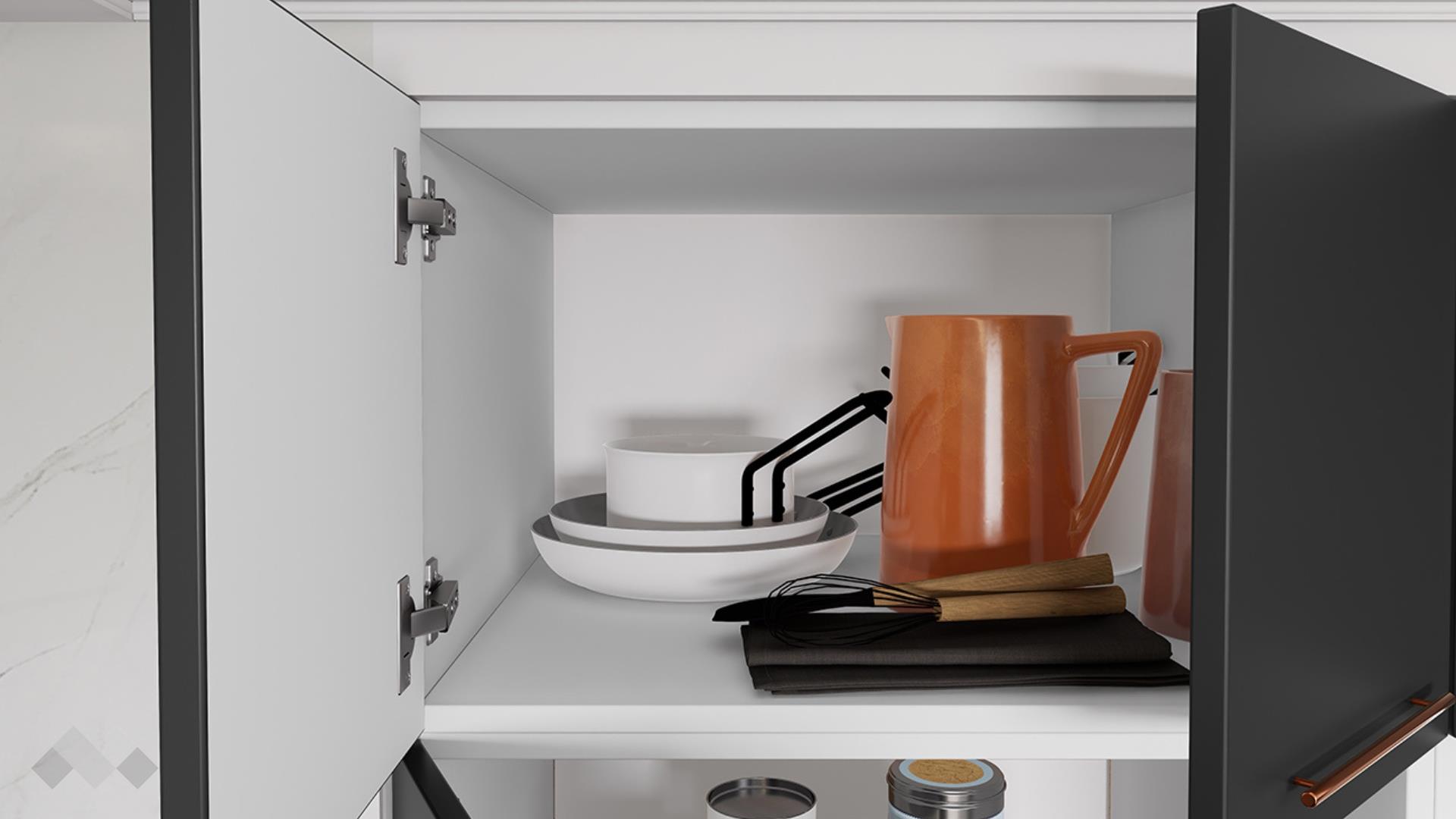 Горния ред шкафове са удобни и функционални - побират малко изполваните уреди и съдове. Основния ред горни шкафове са просторни за най-често използваните уреди и посуда. Шкаф стандартен размер за вграждане на хладилник - за да бъде всичко в синхрон. Шкаф за вграждане на фурна и микровълнова. Долния ред шкафове е функционално подбран - перфектната комбинация на рафтове и чекмеджета, за да поберат често използваните уреди, подправки и посуда.