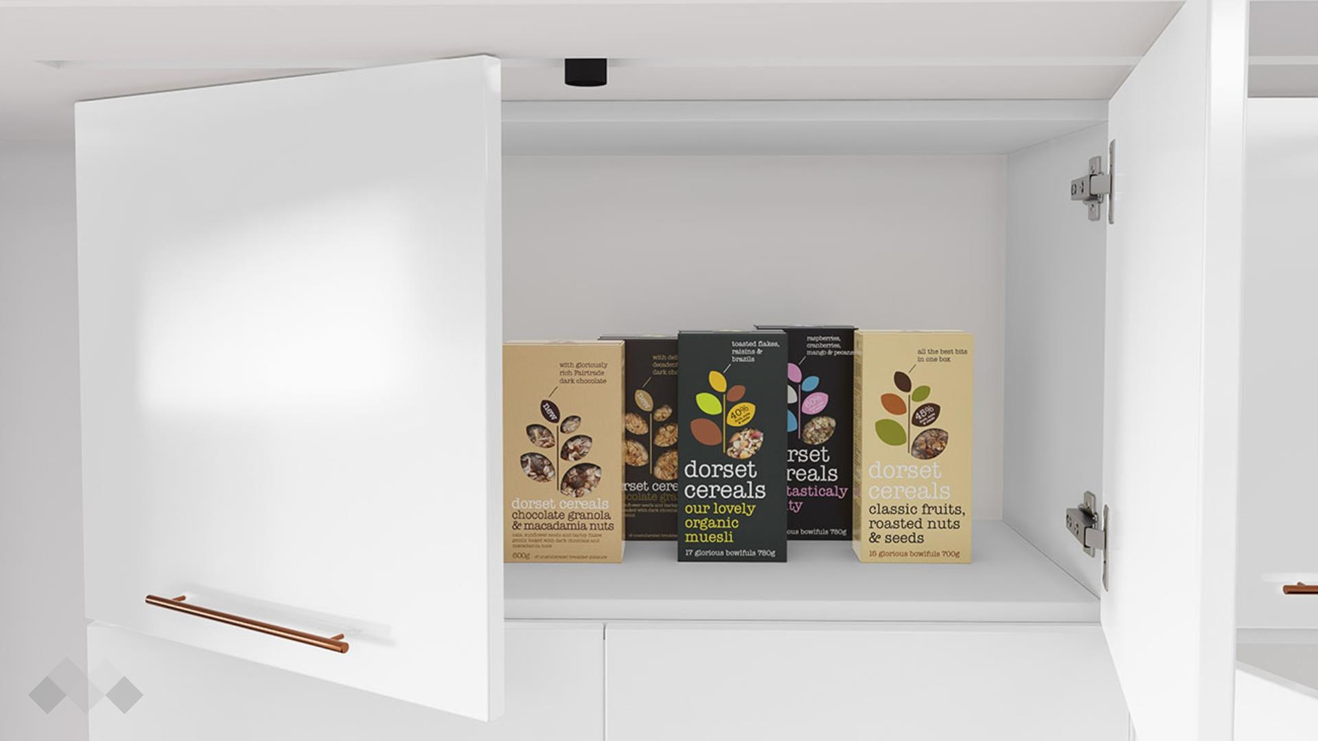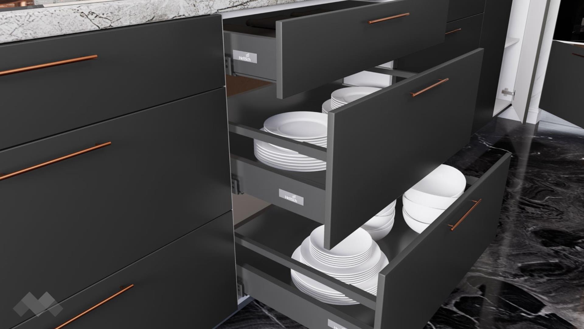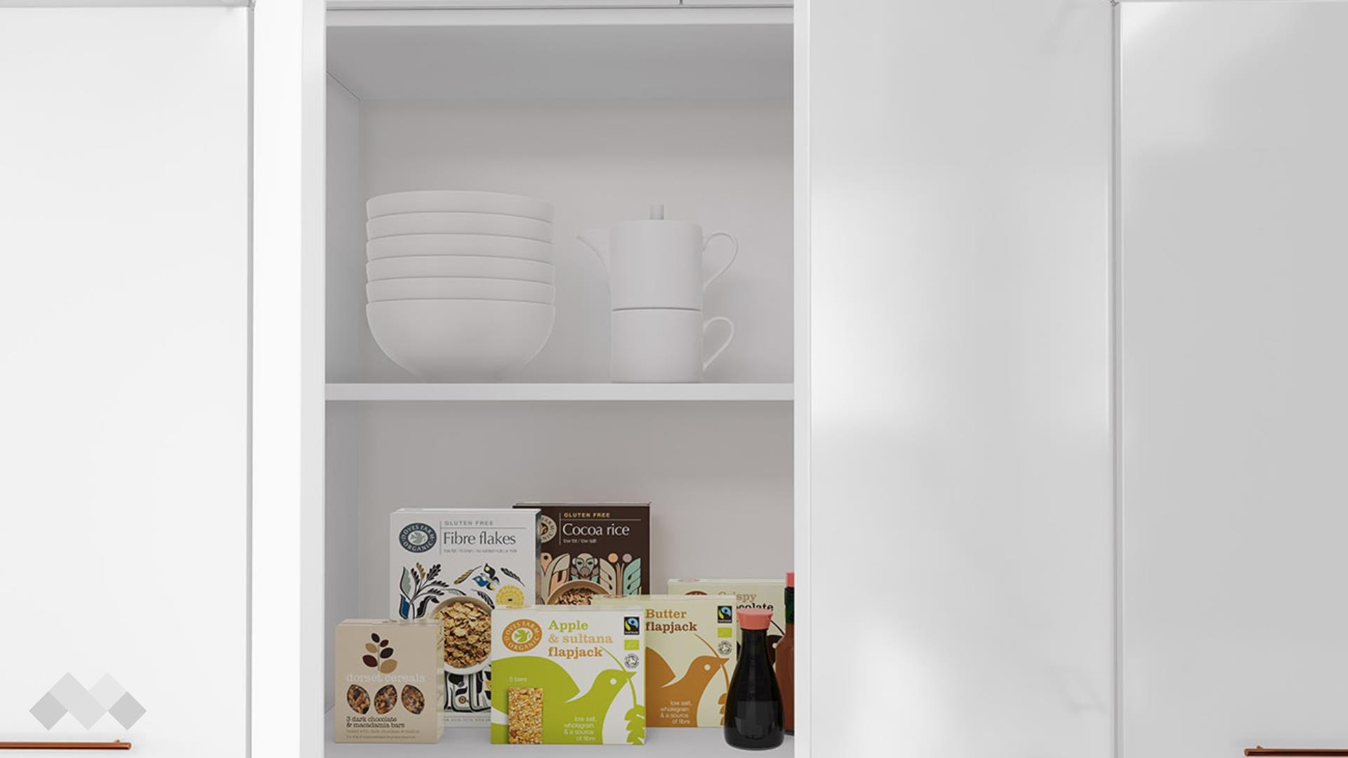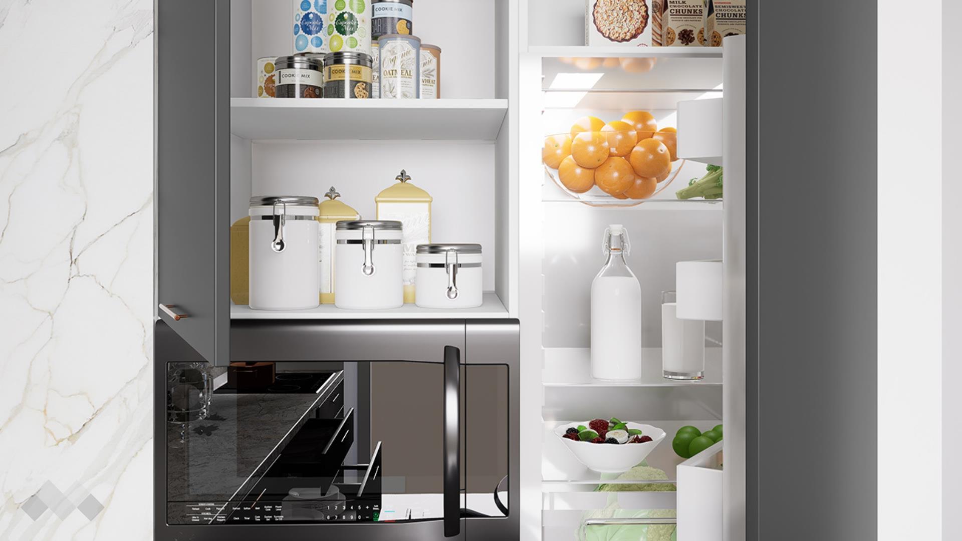 Горния ред шкафове са удобни и функционални - побират малко изполваните уреди и съдове. Основния ред горни шкафове са просторни за най-често използваните уреди и посуда. Шкаф стандартен размер за вграждане на хладилник - за да бъде всичко в синхрон. Шкаф за вграждане на фурна и микровълнова. Долния ред шкафове е функционално подбран - перфектната комбинация на рафтове и чекмеджета, за да поберат често използваните уреди, подправки и посуда.